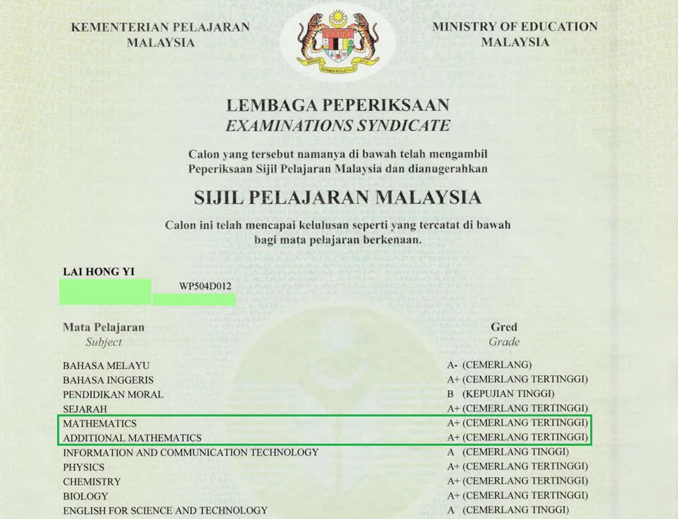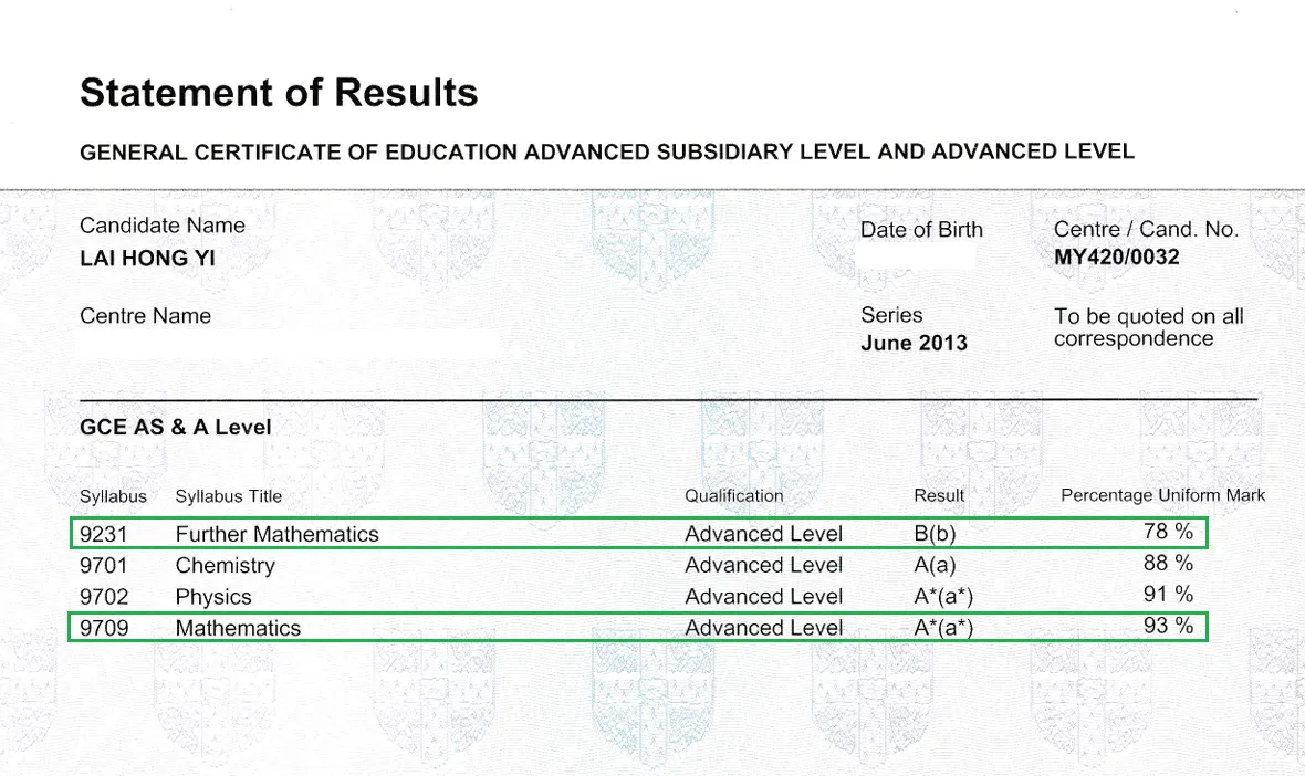 Track record involving maths – obtained 93% (A*) and 78% (B) for Maths and Further Maths CIE A-level respectively, as well as 2A+ for both Maths and Add Maths SPM.
