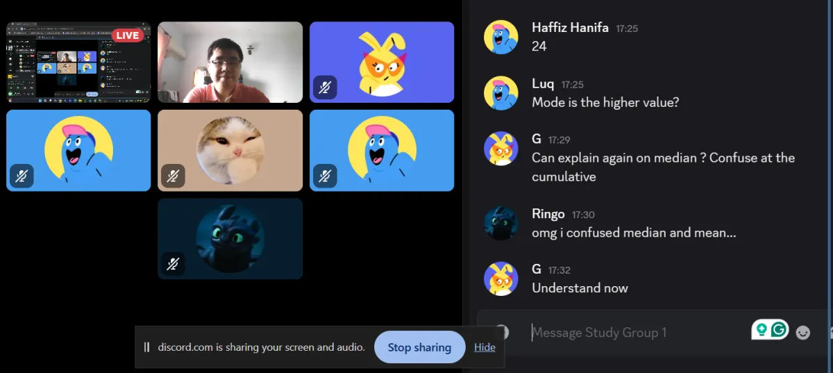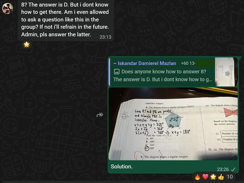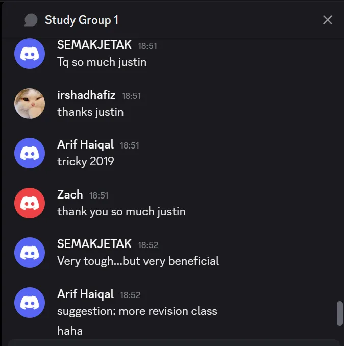 Questions from my own sources and past-year exam papers are distributed to each student and assessed online for everyone to view, but use your textbooks and other reference books to share solutions to problems for Justin Lai to assess.