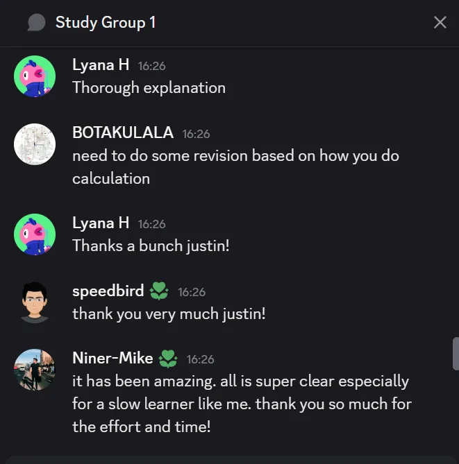 Each student does at least one different question after each session to post the solution(s) into a WhatsApp group for discussion. It's better to learn together from mistakes early on than to make them during any exam.