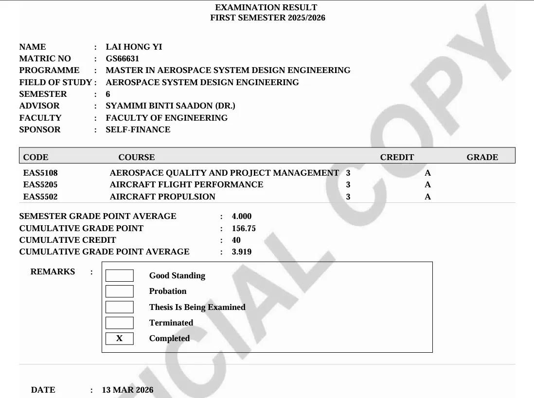 Completed an Aerospace Engineering postgraduate degree – Master in Aerospace System Design Engineering class of 2026, with a CGPA of 3.919.